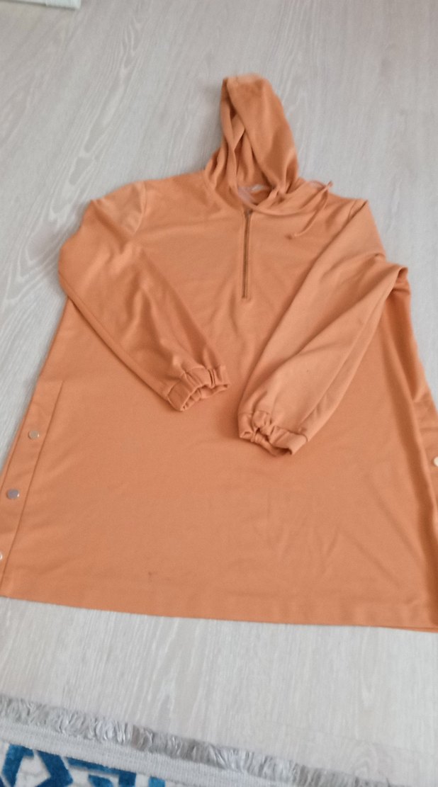 Bej renkli, kapüşonlu ve düğmeli detaylara sahip uzun kollu tunik. Yumuşak sentetik kumaştan, salaş kesim ve uzun boyda, günlük sokak stili için uygun.