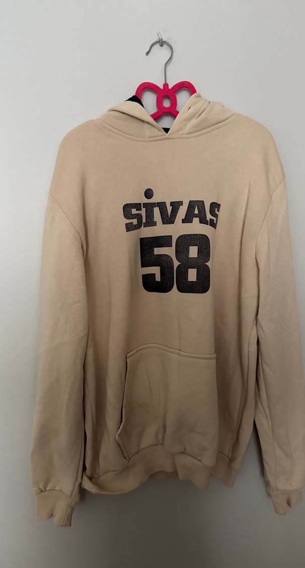 Bej kapüşonlu, ön cepli, bol kesim uzun kollu sweatshirt. Yumuşak süet kumaştan, üzerinde '58 SiVAS' baskısı bulunur.