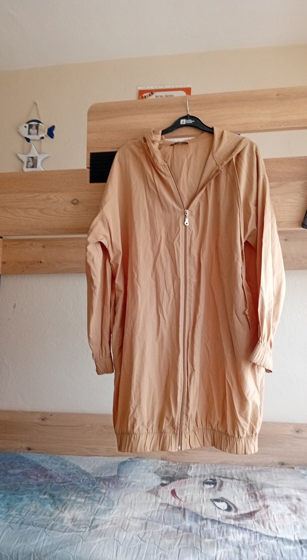 Bej renkte, uzun ve kapüşonlu kadın yağmurluğu. Rahat kesimi ve uzun kolları ile hafif keten kumaştan yapılmıştır, minimalist sokak stili için uygundur. ️