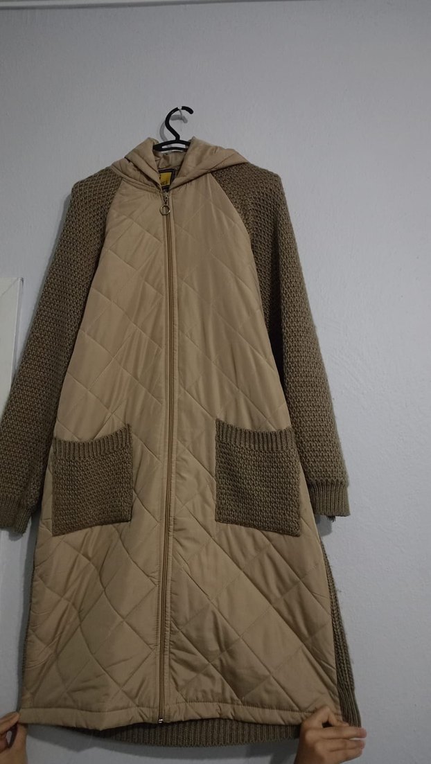 Bej renkli, kapüşonlu ve uzun kollu bu uzun ceket, örgü triko ve kapitone kumaşın birleşimiyle rahat ve salaş bir görünüm sunar. Örgü detaylı kollar ve cepler bulunur.