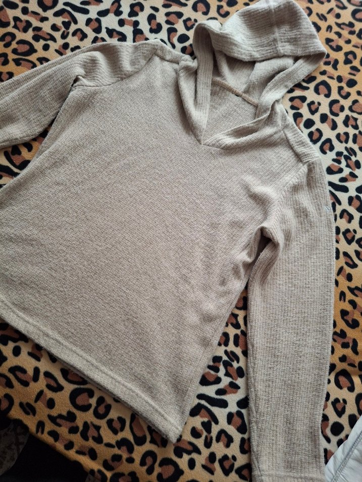 Uzun kollu, V yaka kapüşonlu bej triko kadın kazak. Rahat kesim ve yumuşak dokulu, günlük sokak stili için uygundur.