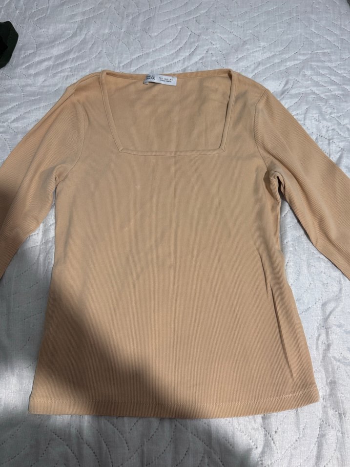 Bej renkte, tek renk ve uzun kollu kadın bluz. Kare yaka.