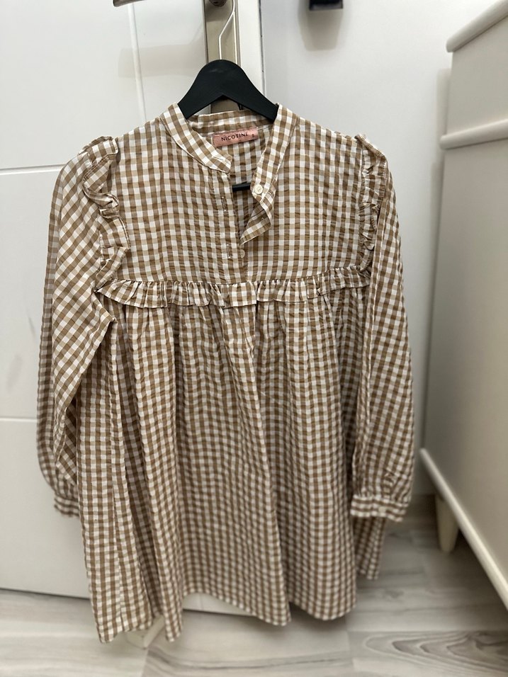 Bej renkli, keten kumaştan yapılmış, uzun kollu ve düğmeli, bol kesim kareli bohem tunik. Günlük kullanıma uygun rahat bir modeldir.