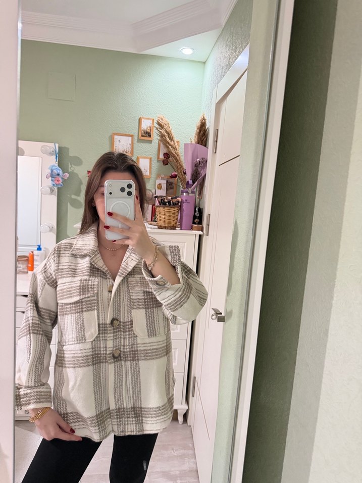 Bej kareli pamuklu, düğmeli, uzun kollu gömlek. Salaş kesimi ve yakalı tasarımıyla günlük kullanıma uygun rahat bir parça.