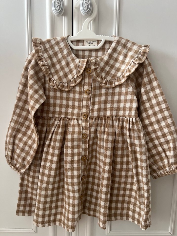 18-24 ay. Yumuşak pamuklu kumaştan, uzun kollu ve bol kesim kız çocuk elbisesi. Bohem tarzda, yakalı ve fırfırlı, pastel kareli desene sahip.