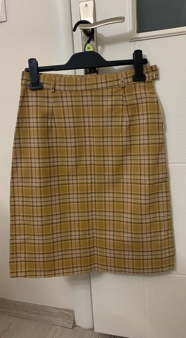 Pamuklu kumaştan tokalı, bej kareli midi etek. Ofis kullanımı için uygun vintage desenli ve normal kesim etek Çalışırken kullandım kesinlikle ömürlük yıpranmaz rengi tam kışa uygun kahve çizmeyle harika oluyor
