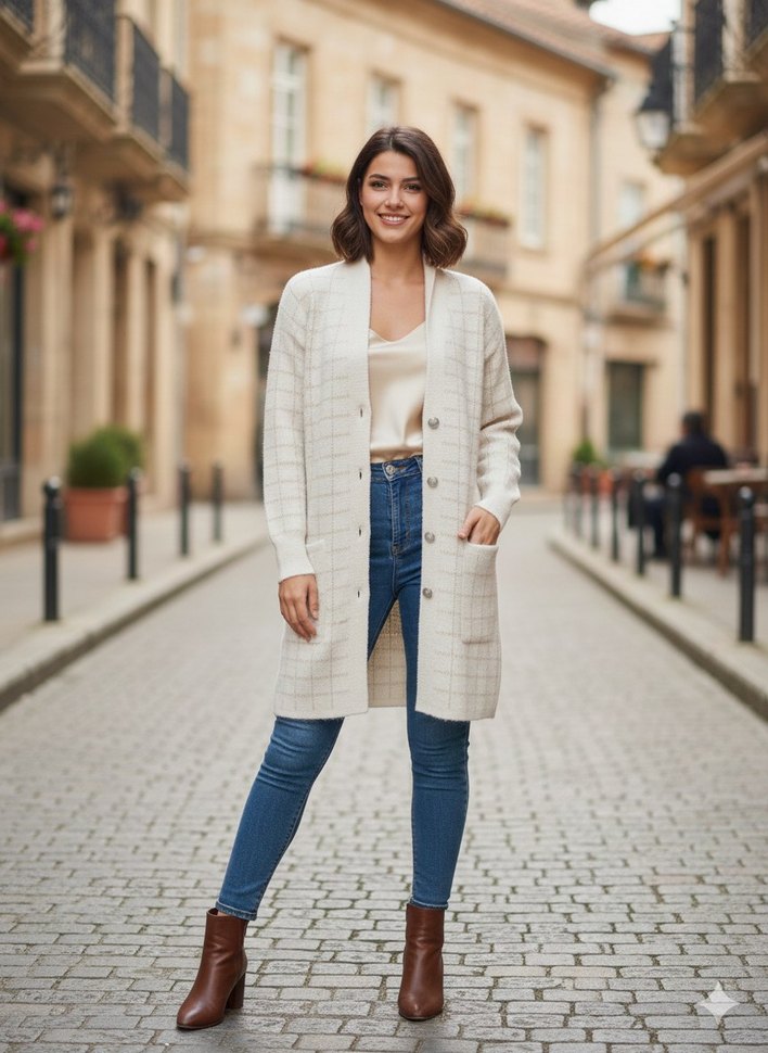 Bej renkli, kareli desende, notlu yaka ve uzun kollu midi boy triko hırka. Rahat kesimi ve günlük kullanıma uygun tarzıyla öne çıkar. tek ebat olarak