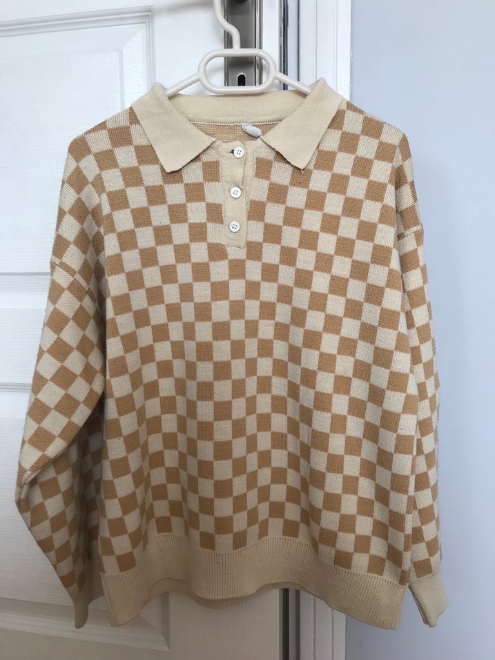 Bej renkte, uzun kollu, yakalı ve kareli desenli örgü kadın kazak. Rahat ve salaş kesim, günlük kullanım için uygun.