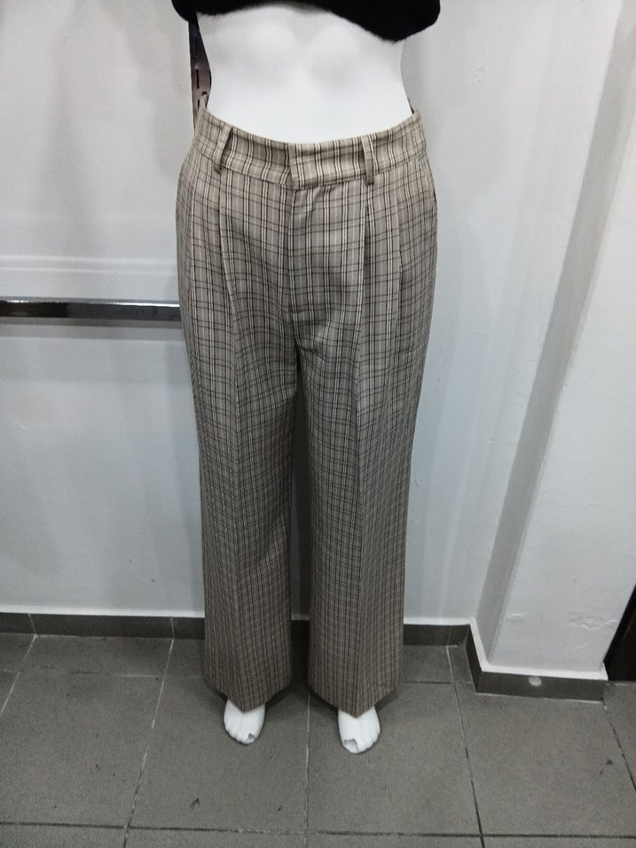 Bej kareli pilili, normal boy, regular fit kadın kumaş pantolon. Ofis ve günlük kullanıma uygun sentetik kumaştan üretilmiştir.