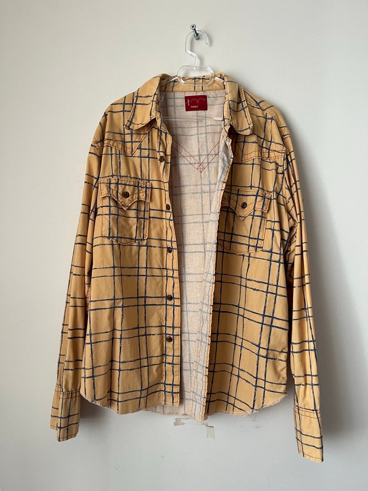 Bej kareli keten gömlek, uzun kollu ve kesik yaka detaylıdır. Bol kesim ve düğmeli ön kısmı ile günlük rahat giyim için uygundur. ✨