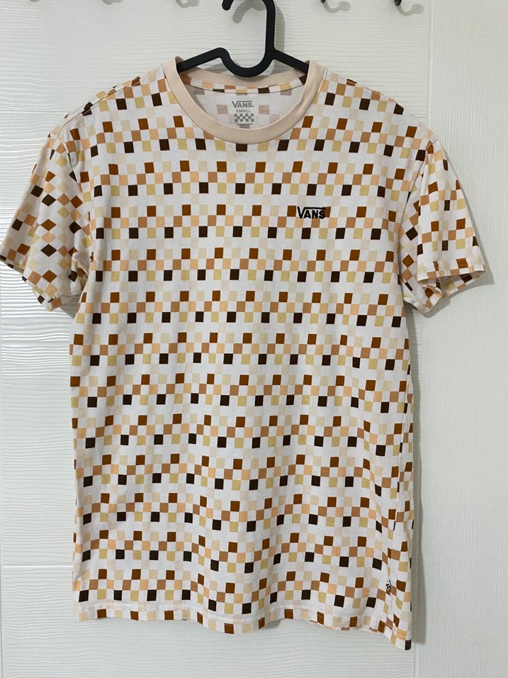 Bej kareli desenli Vans kısa kollu tişört, bisiklet yaka ve rahat kesimiyle gündelik şıklık sunar.