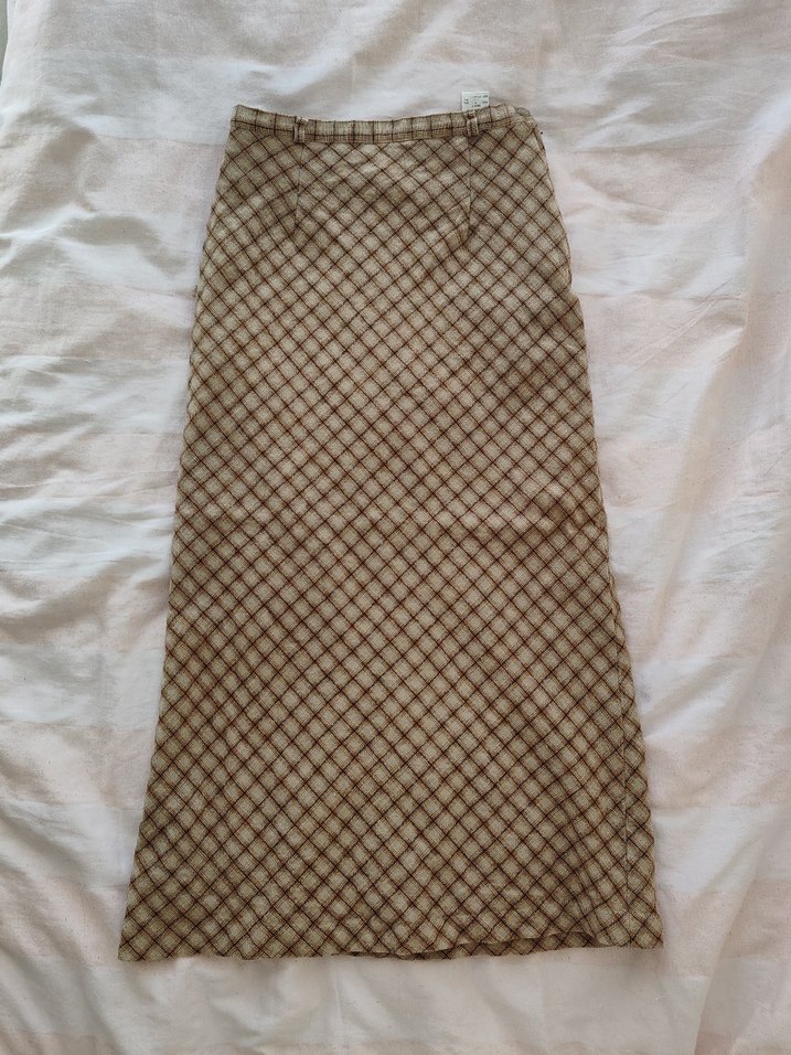 Bej kareli desende, keten kumaştan, drapeli ve ince kesime sahip uzun etek. Bohem, retro ve Paris tarzını yansıtır. BEL 33cm, BOY 85cm