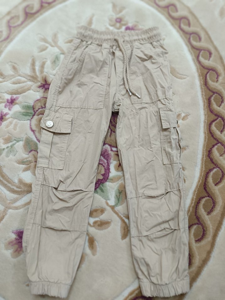 Pamuklu kumaştan yapılmış, düğmeli cepleri ve kamuflaj desenli, bol kesim bej kadın kargo pantolon. Outdoor rahat kullanım için uygundur.