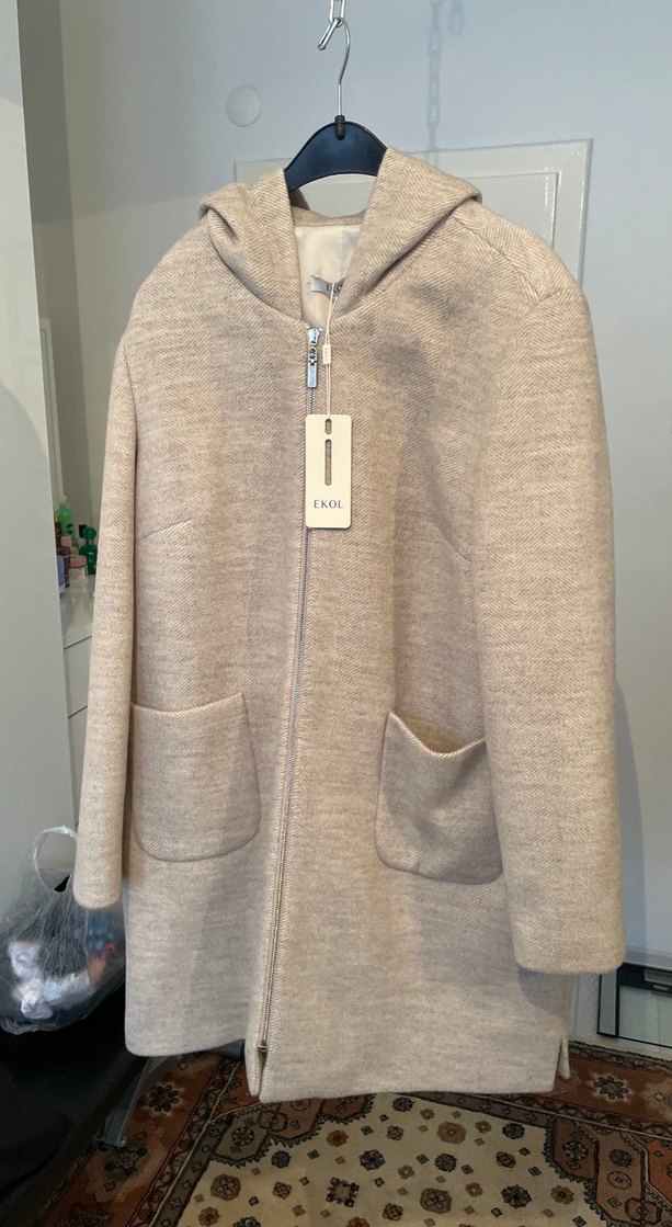 Bej renkte, yumuşak dokulu yün kaban Fermuarlı, uzun kollu, cepli ve rahat kesimlidir. Günlük kullanıma uygundur. Büyük bedendir. Beden: 3 42 bedene denktir
