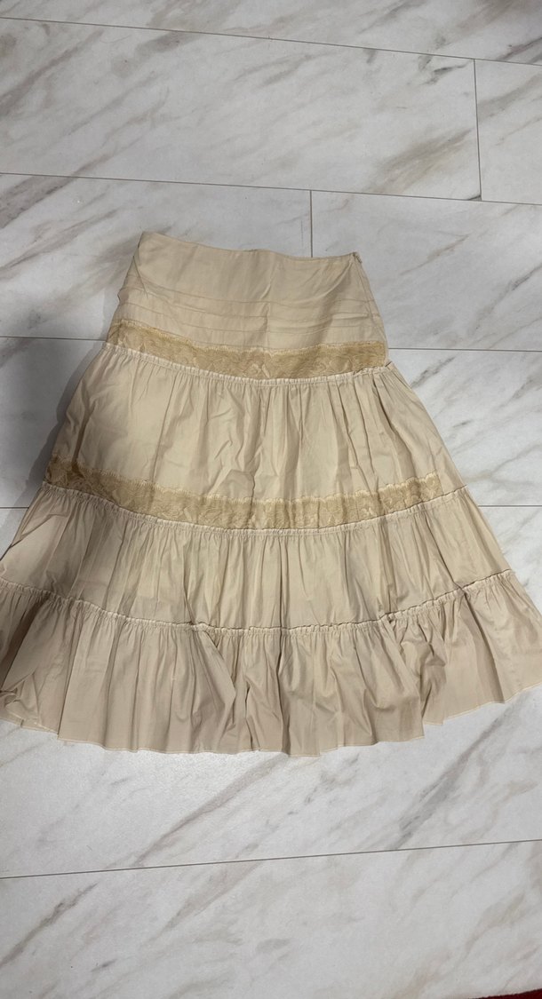 Bej renkli, yumuşak keten kumaştan yapılmış katlı volan detaylı midi etek. Bol kesimi ve bohem tarzıyla günlük kullanıma uygundur.