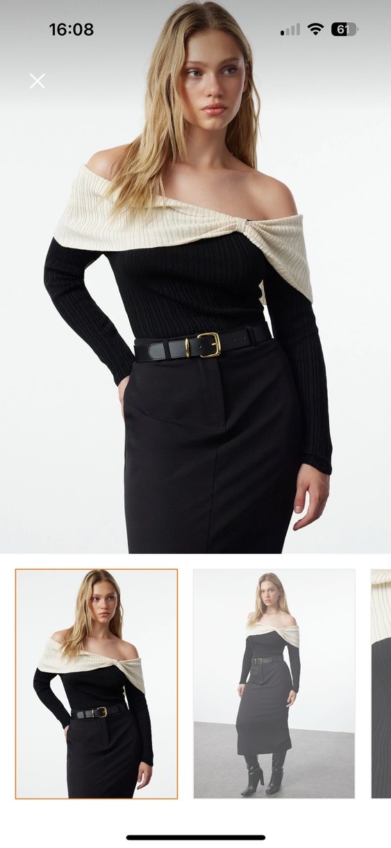 Bu dar kesim kadın bluz, bej kayık yaka ve omuz açık detay ile kemerli bel tasarımına sahiptir. Uzun kollu, midi boy ve ofis şıklığı için uygundur.Hiç giyilmedi