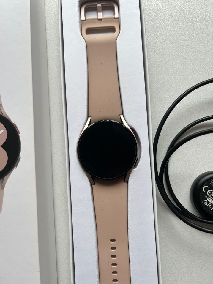 Koyu renkli akıllı saat, bej kayış ve yuvarlak ekrana sahip. Şarj kablosu ile birlikte geliyor.⌚