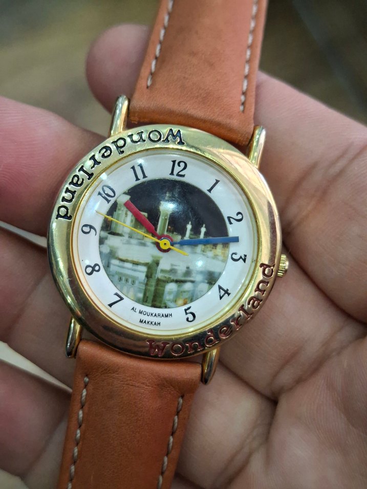 Bej kayışlı, tokalı kadın saati. Renkli kadranda 'AL MOUKARAMA' yazısı ve eşsiz bir resim bulunur. Altın renk kasa üzerinde 'Wonderland' yazısı yer alır. ⌚