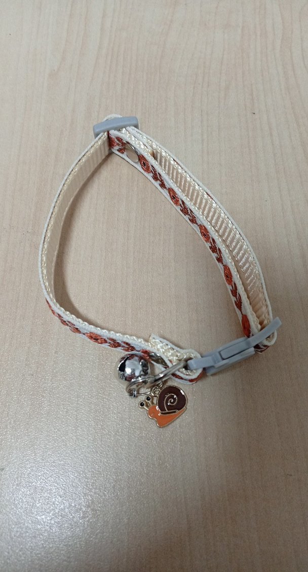 Bej renkte, gri detaylı kedi boyun tasmasıdır. Küçük zil ve salyangoz figürlü süsü vardır.