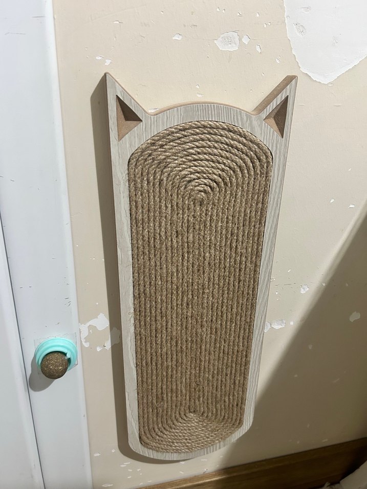 Bej renkte, kedi yüzü şeklinde duvara monte edilen doğal ipten yapılmış tırmalama tahtasıdır.
