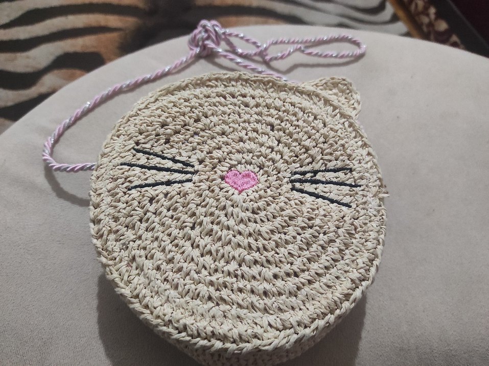 Bej renkli, kedi yüzü figürlü örgü çanta. Pembe kalp şeklinde burun ve siyah bıyık detayları ile pastel pembe askıya sahip.