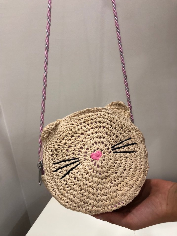 Pembe kalp burunlu ve bıyıklı kedi yüzü desenli bej renkli örgü çanta, pembe beyaz askıya sahiptir.