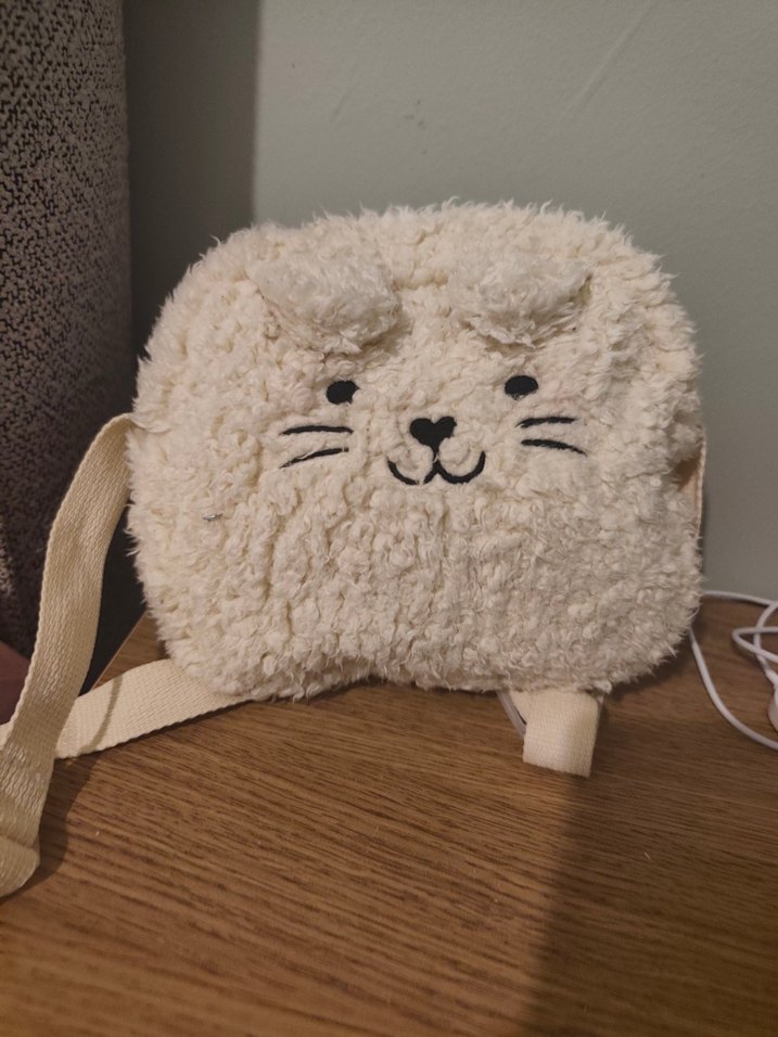 Yumuşak dokulu, kedi yüzü desenli bej peluş çanta, kolay taşınması için omuz askısı ile birlikte.