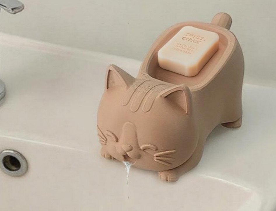 Pastel tonlarda, su tahliyesi için küçük delikli bej kedi şeklinde sabunluk.
