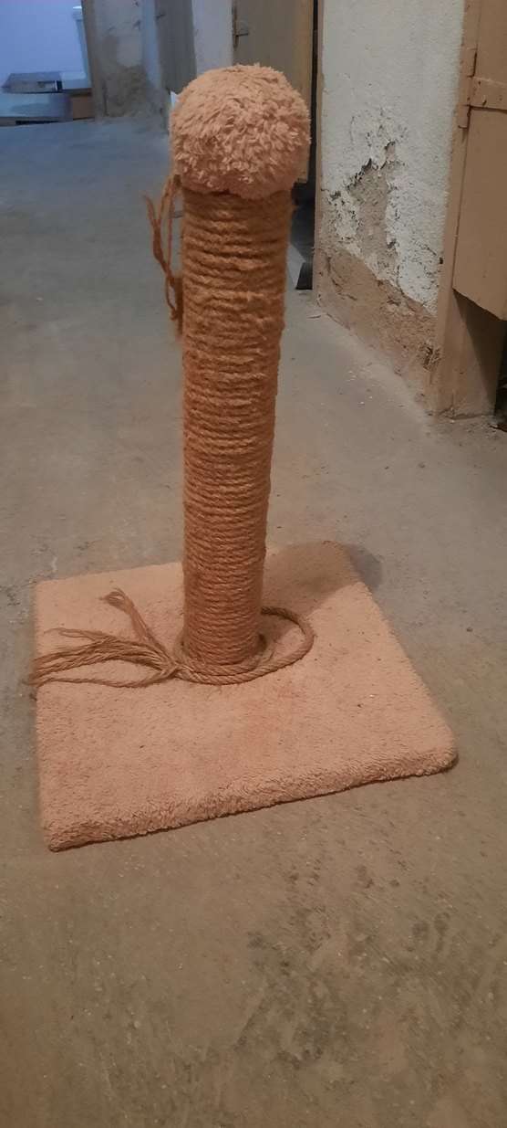 Bej renkte, doğal ip sarılı sağlam tabanlı kedi tırmalama direği.