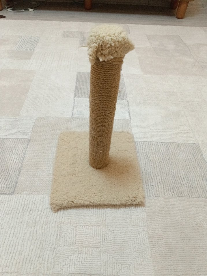 Bej renkte, yumuşak tabanlı ve üstü tüy kaplı kedi tırmalama direği. Kediler için tırmalama ve oyun imkanı sağlar.