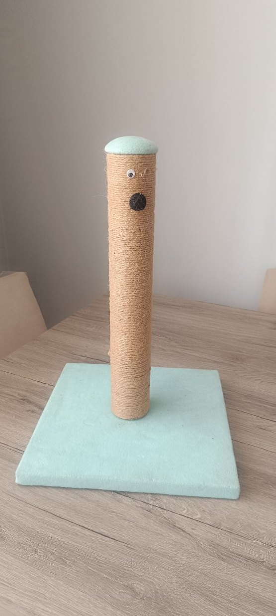 Bej renkte, pastel detaylı taban ve üst kısmı olan kedi tırmalama direği. Doğal iplikle kaplı sağlam yapısı ile kedilerin tırmalaması için uygundur.