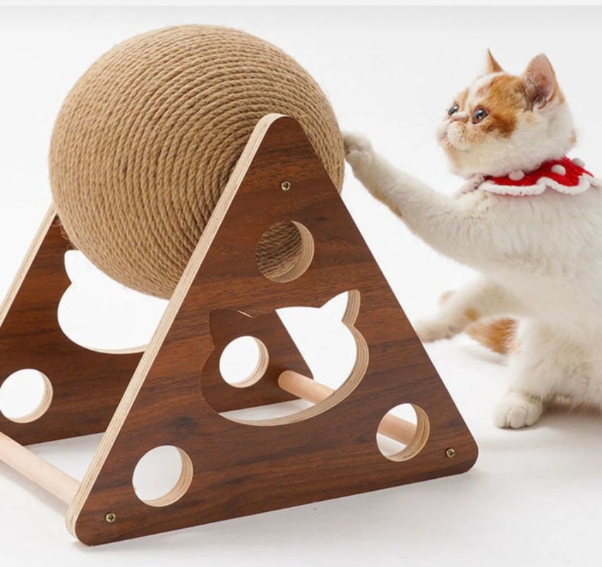 Ahşap standlı, bej renkli kedi tırmalama topu, kedilerin eğlenmesi ve tırnak bakımı için uygundur.