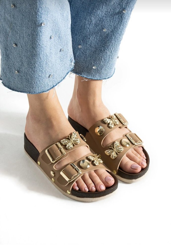 Bej renkli, tokalı kayışlara sahip platform topuklu kadın terlikleri, parlak kelebek süslemeleriyle denim malzemeden, günlük sokak stili için uygundur.
