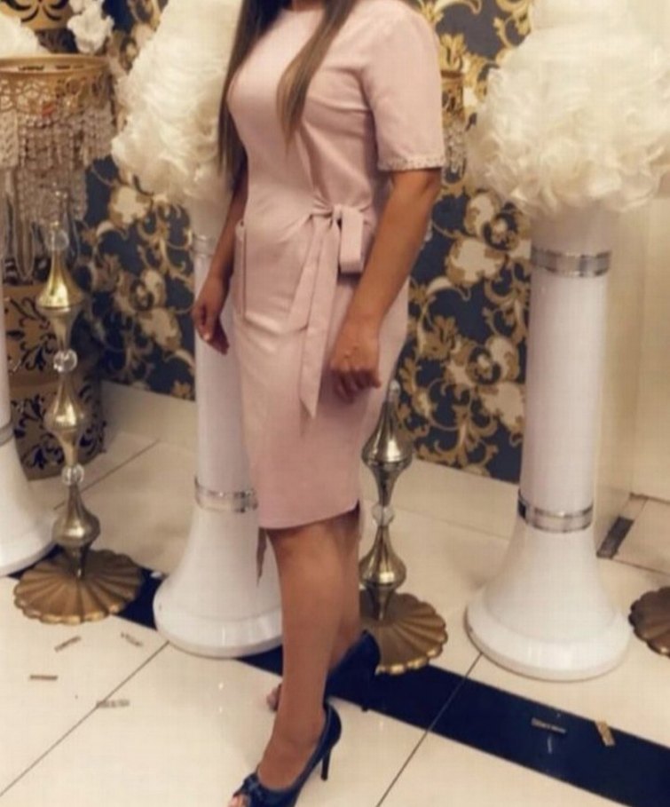 Bej renkli, kısa kollu ve kemer detaylı mini kalem elbise, yumuşak sentetik kumaştan, gündelik ofis kullanımına uygun.