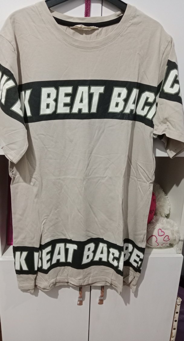 Bej ve gri tonlarda, kemerli detaylı, baskılı, kısa kollu, bol kesim erkek tişört, sentetik kumaştan üretilmiştir.