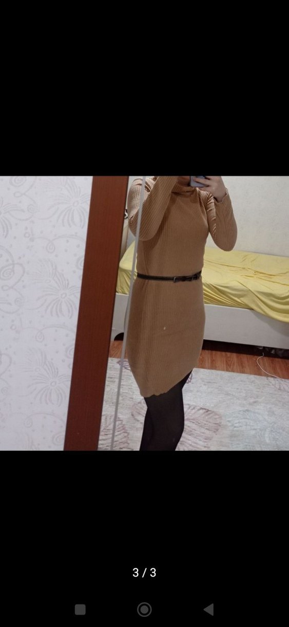 Bej renkli, kemerli ve boğazlı triko elbise. Midi boy, uzun kollu ve vücuda oturan kesimiyle rahat ve şık bir görünüm sunar.