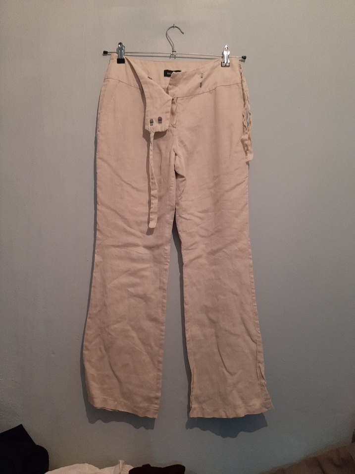 Bej renkte, keten kumaştan, kemerli ve bol kesim midi boy pantolon. Günlük kullanıma uygun, bohem tarzda rahat bir model.