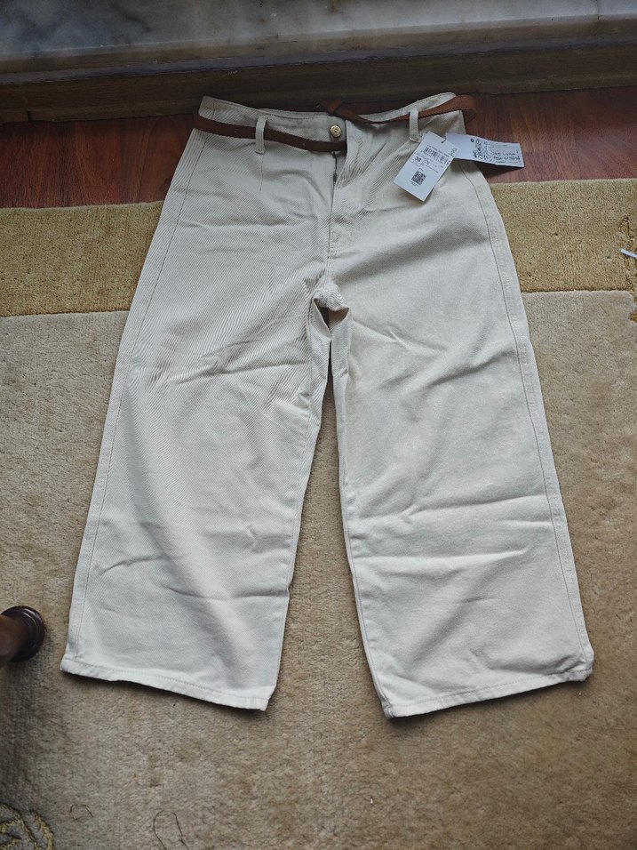 Bej renkte, pamuklu kumaştan, kemerli ve bol kesim midi uzunlukta kadın pantolon. Günlük rahat sokak stili için uygundur. Pantolonun boy uzunluğu 82cm dir.