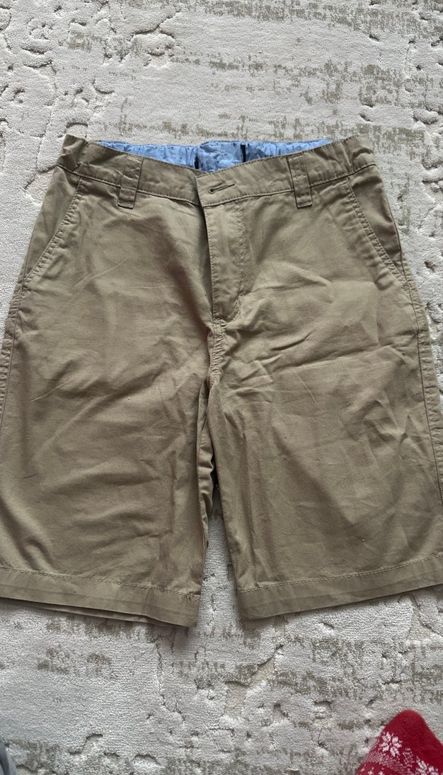 Kemerli, yan cepli, bol kesim bej keten erkek çocuk şort. Sade ve günlük tarz için uygundur.