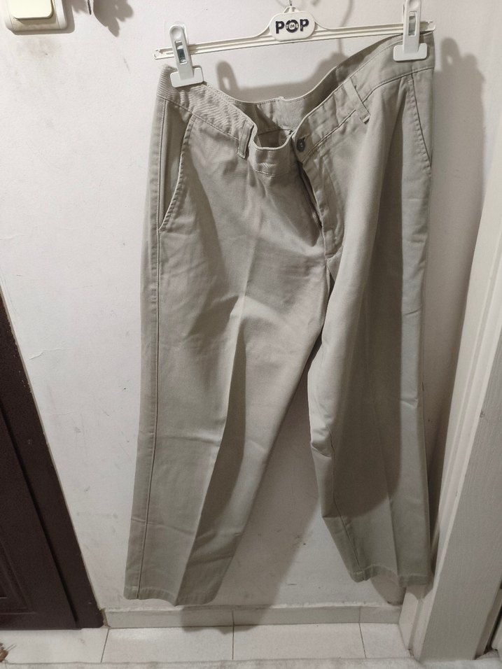 Bej renkli, keten kumaştan yapılmış erkek pantolonu. Normal boy, kemerli ve düz desensiz. Günlük sokak stili için uygun. POP marka.