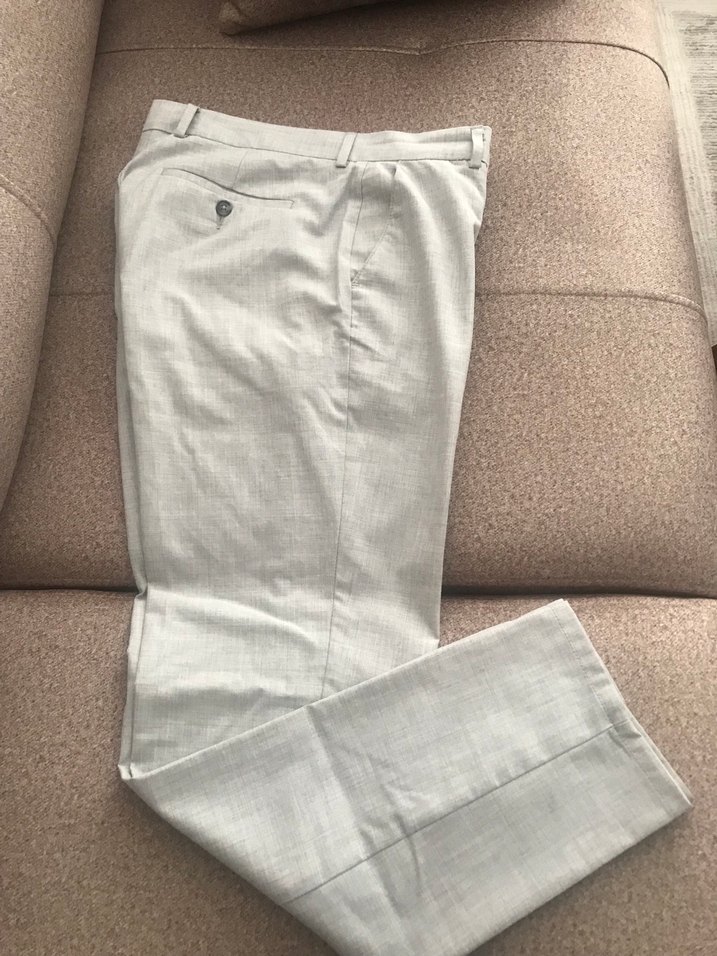Bej renkte, keten kumaştan yapılmış, kemerli ve normal boyda erkek pantolonu. Düz ve desen içermeyen tasarımıyla ofis kullanımı için uygundur.
