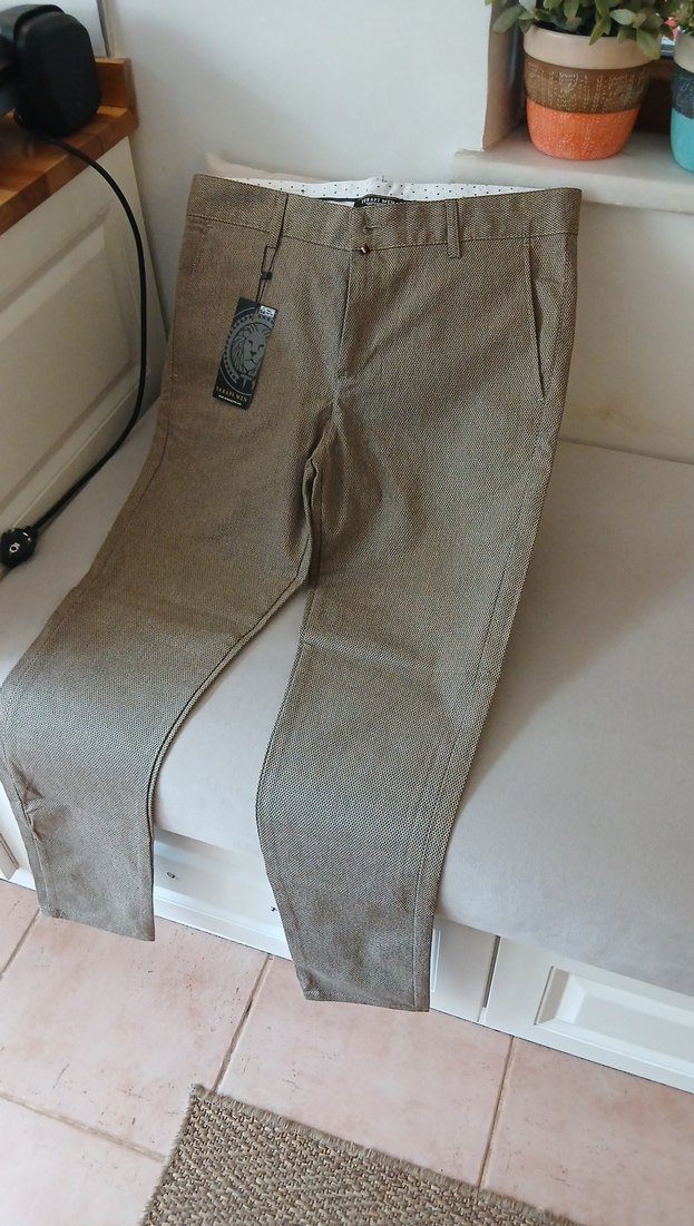 Bej renkte, kemerli ve keten kumaştan yapılmış erkek pantolonu. Regular fit kesimi ve midi boyuyla günlük rahat sokak stiline uygundur. 31 beden, pamuklu