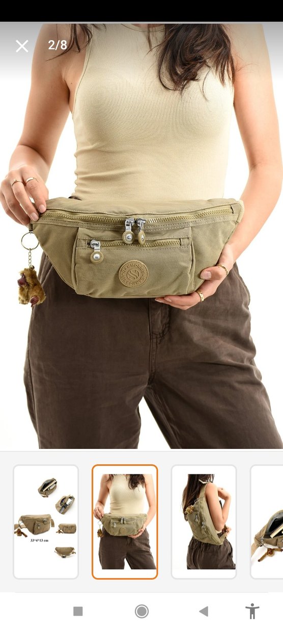 Bej renk, kemerli, sentetik kumaştan yapılmış, minimalist ve sade tasarımlı kadın bel çantası. Açık renk, desensiz, dış mekan ve sokak giyimi için uygun.