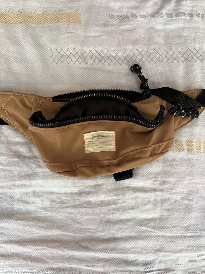 Bej renkte, kemerli ve sentetik kumaştan yapılmış kadın bel çantası. Minimalist ve desensiz tasarımıyla günlük kullanıma uygundur.
