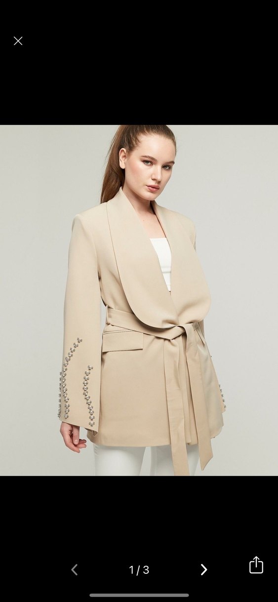 Bej renkli, kemerli blazer, uzun kollu ve kesimli yakaya sahip. Parlak dokusu ve kol detaylarıyla ofis ve sokak stili için uygun. ✨40 beden 75 cm uzunluk 50 cm koltuk altı genişlik