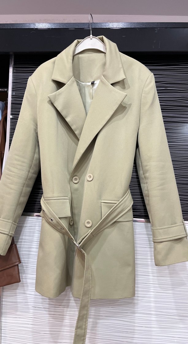 Bej renkli, kemerli, yakalı ve normal kesim kadın blazer ceket. Yumuşak sentetik kumaştan, askılı kollu ve midi boyda, ofis için uygun.