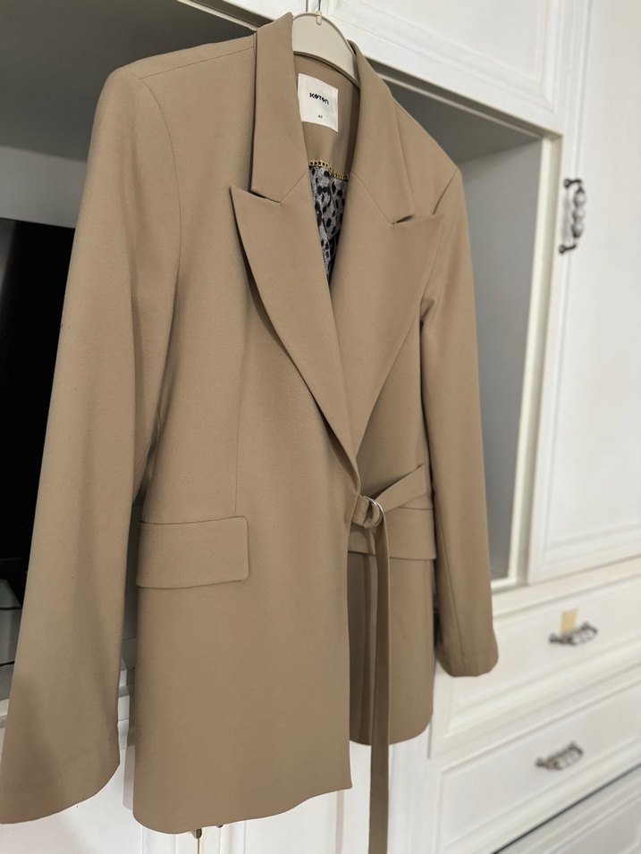 Bej renkli, kemerli, kesik yakalı, normal boyda kadın blazer ceket. Suni kumaştan üretilmiş, ofis kullanımı için uygun, klasik tarzda bir parça.