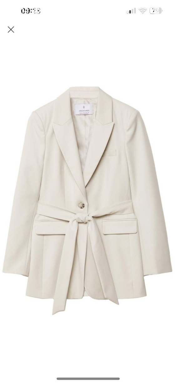 Bej renkli, kemerli ve kesimli yakalı kadın blazer ceket. Normal uzunlukta, askılı kollu ve sentetik kumaştan üretilmiştir. Ofis için modern klasik tarzda tasarlanmıştır.