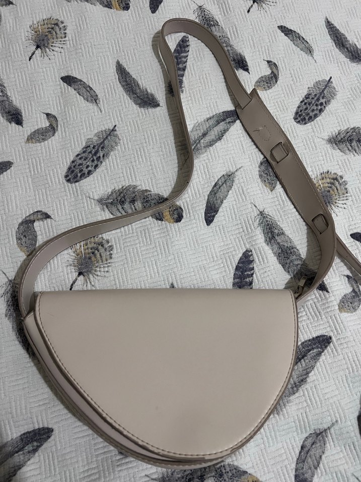 Bej çanta, kemerli ve ayarlanabilir askılıdır. Günlük kullanıma uygun, trend sokak stili için ideal.