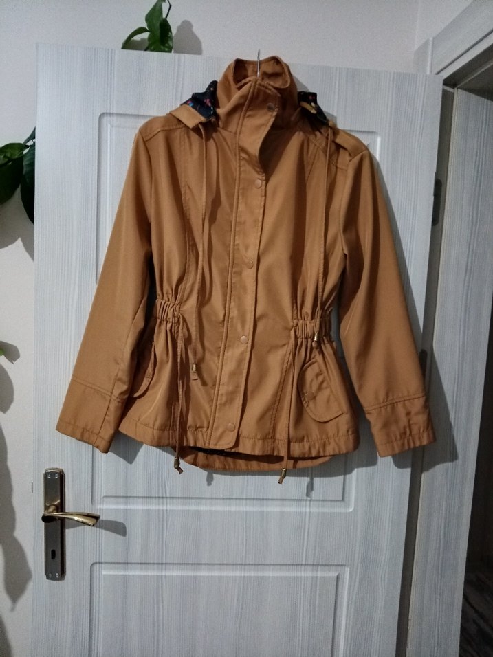 Bej renkli, kemerli ve uzun kollu kadın ceket. Salaş kesimi ve kesilmiş yakasıyla dış mekan kullanımı için uygun, parlak sentetik kumaştan yapılmıştır.